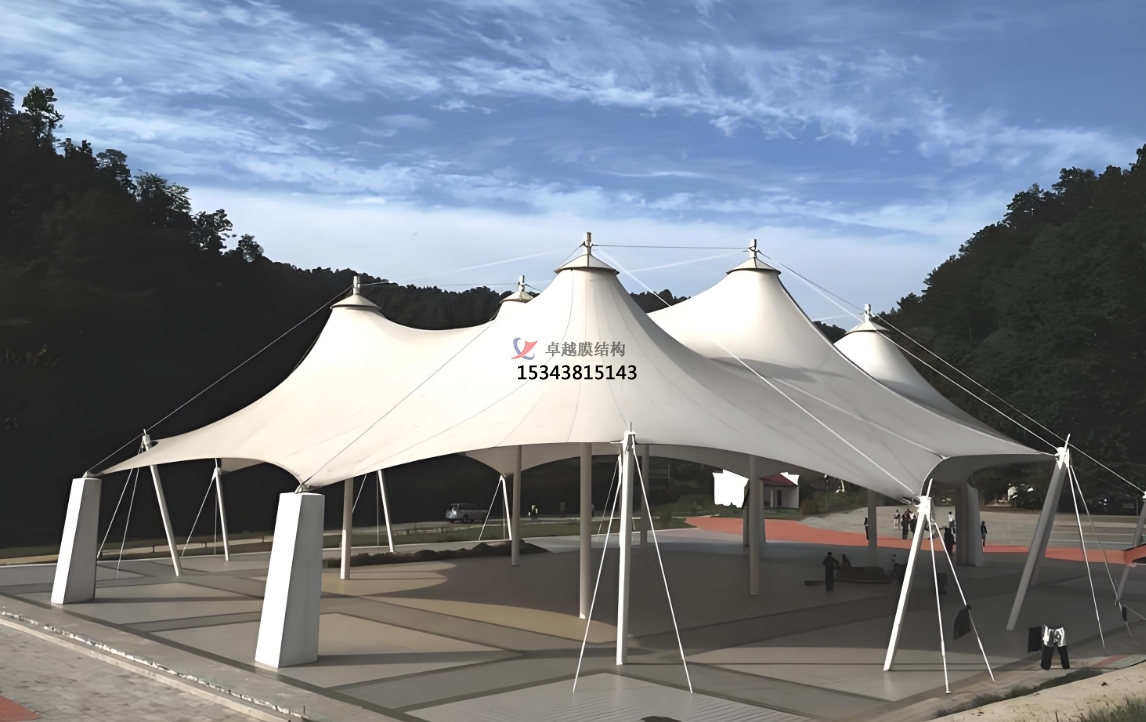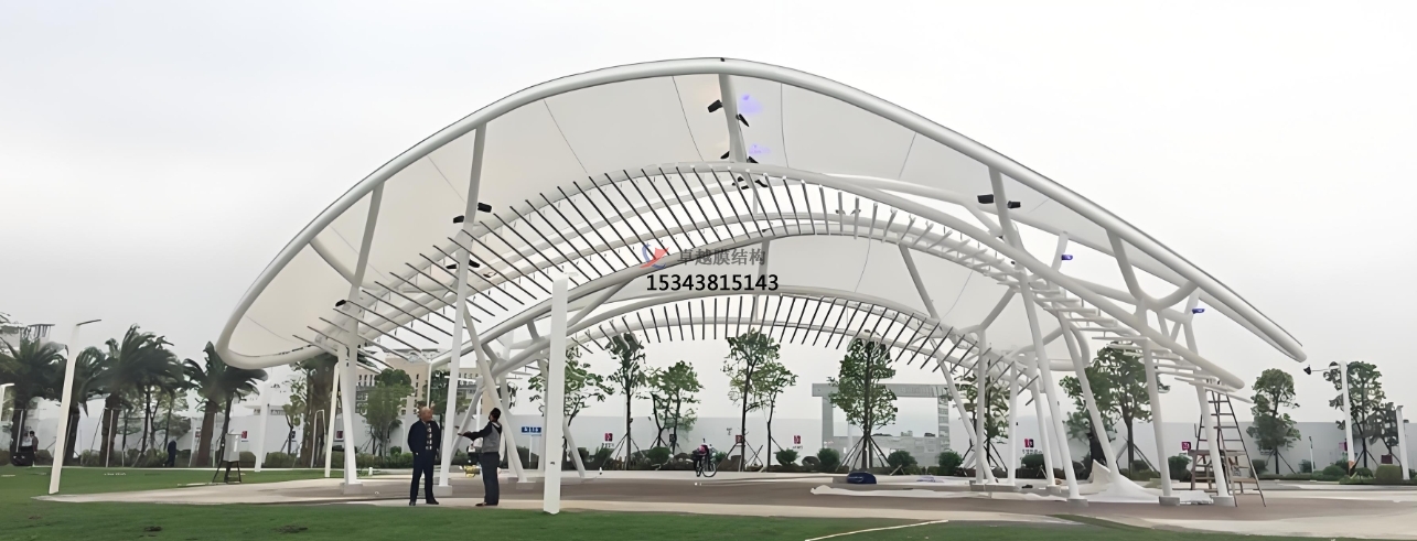 在實(shí)際應用方面,景觀(guān)膜結構的身影遍布各個(gè)領(lǐng)域。在城市公園與廣場(chǎng),它常被用于搭建遮陽(yáng)避雨的設施,如長(cháng)廊、亭子等。這些膜結構設施不僅為市民提供了舒適的休閑空間,讓人們在戶(hù)外活動(dòng)時(shí)免受日曬雨淋,其獨特的造型和光影效果,還為公園增添了濃厚的藝術(shù)氛圍,成為人們拍照打卡的熱門(mén)地點(diǎn)。在體育場(chǎng)館,大型的膜結構屋頂和看臺設計屢見(jiàn)不鮮。膜結構減輕了建筑自重,提高了場(chǎng)館的抗震性能,在舉辦賽事時(shí),獨特的膜結構造型配合燈光效果,能夠營(yíng)造出熱烈而獨特的觀(guān)賽氛圍,增強觀(guān)眾的觀(guān)賽體驗。商業(yè)街區和步行街也廣泛應用景觀(guān)膜結構,可作為臨時(shí)的商業(yè)展示空間,或是裝飾性的建筑元素,吸引顧客的注意力,提升商業(yè)空間的品質(zhì)和吸引力,促進(jìn)商業(yè)活動(dòng)的開(kāi)展。
