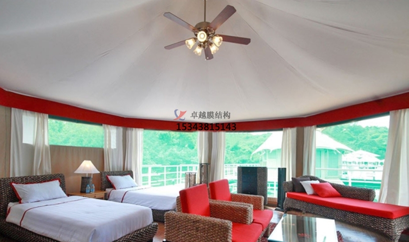 膜結構帳篷酒店膜材是一種無(wú)毒的高分子材料。它具有無(wú)味的特點(diǎn),安裝后沒(méi)有一絲味道。另外,它擁有抗紫外線(xiàn)和反射光線(xiàn)極強的特點(diǎn),而且其抗撕裂的性能強,還有B1/M2級別的阻燃性能,并且使用壽命極強,一般壽命都在20年以上。