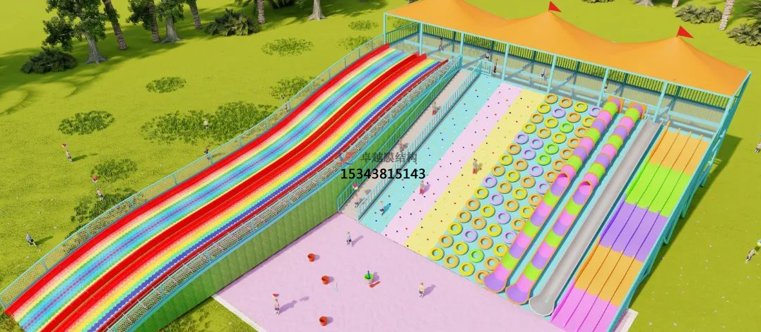 長(cháng)治彩虹滑道新款張拉膜頂設計是一種創(chuàng )新的滑道設計,它采用了張拉膜結構作為滑道的頂部,這種結構不僅美觀(guān),而且具有很好的遮陽(yáng)和防雨效果。彩虹滑道是一種具有多彩顏色的滑道,游客可以乘坐橡皮艇在滑道上滑行,享受刺激和樂(lè )趣。