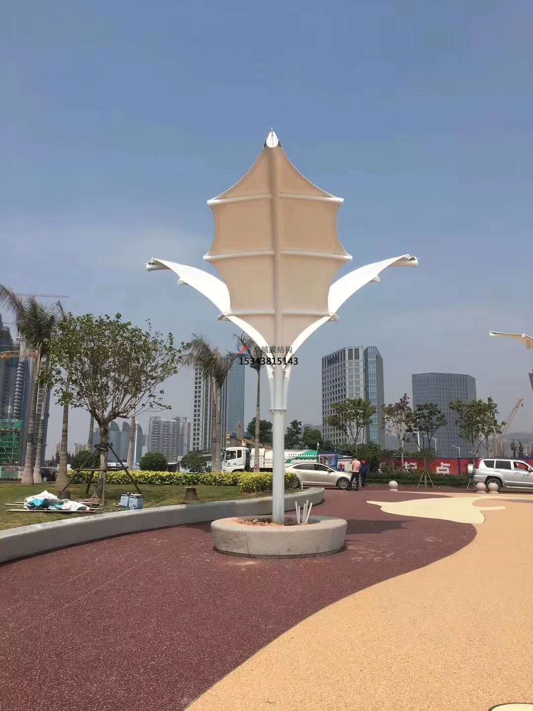 2、一個(gè)城市的中心區反映一個(gè)城市的地理風(fēng)貌和民族風(fēng)情,同時(shí),也是一個(gè)城市文化發(fā)展程度的標志。而景觀(guān)設計要求其具有廣泛的可讀性、雅俗共賞,既有超凡脫俗的藝術(shù)價(jià)值,又能使大眾喜聞樂(lè )見(jiàn)與大眾息息相通。張拉膜以其輕盈飄逸的造型、柔美并帶有力量的曲線(xiàn)和大跨度和大空間的鮮明個(gè)性和標識性,應用于城市小品設計中。