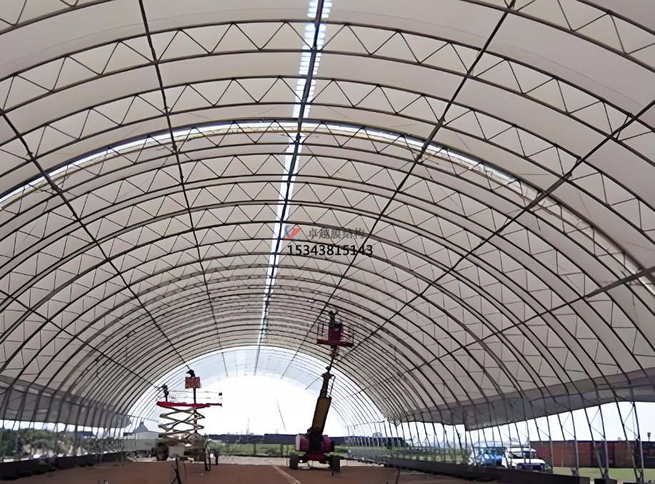膜結構煤棚的施工采用模塊化安裝方式,先在工廠(chǎng)預制好鋼結構骨架和膜材單元,然后運輸到現場(chǎng)進(jìn)行拼裝。這種方式不僅縮短了施工周期,還減少了現場(chǎng)作業(yè)的風(fēng)險。在施工過(guò)程中,通過(guò)液壓同步張拉技術(shù),對膜材的張力進(jìn)行精確控制,確保膜材的應力分布均勻。