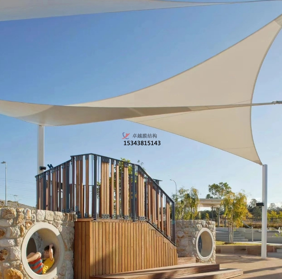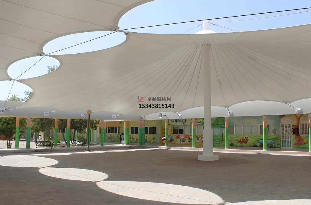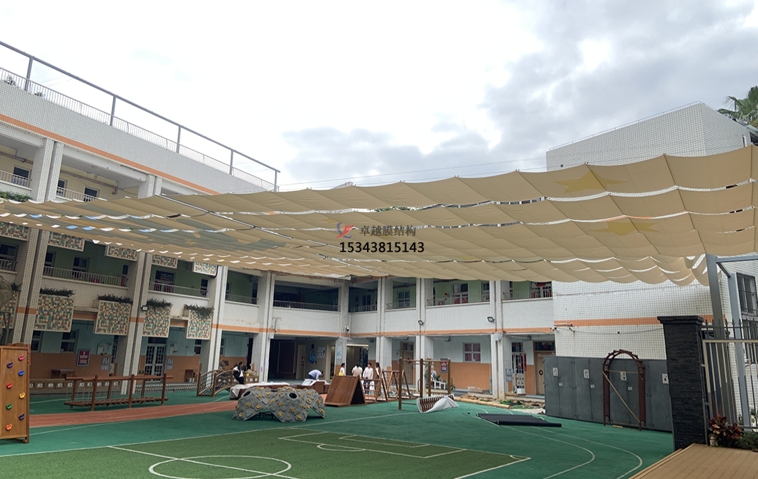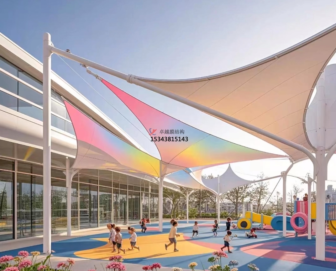 膜材料具有良好的透光性,可以在保證遮陽(yáng)的同時(shí),讓自然光線(xiàn)柔和地灑入室內,為孩子們提供充足的日照,有利于他們的視力保護和身心健康。同時(shí),膜結構的設計通常結合高效的通風(fēng)系統,確保室內空氣流通,即使在炎熱的夏季也能保持室內涼爽,為孩子們創(chuàng )造一個(gè)舒適的學(xué)習環(huán)境。