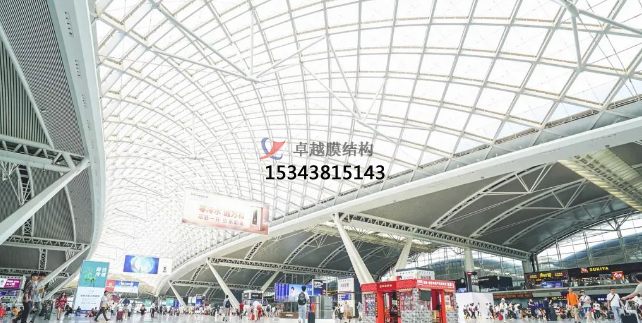作為華南地區最繁忙的高鐵站,廣州南站的“高顏值”備受旅客喜愛(ài)~其屋頂設計獨特,除了傳統的采光玻璃外還使用了高分子透光膜(透明ETFE膜材).