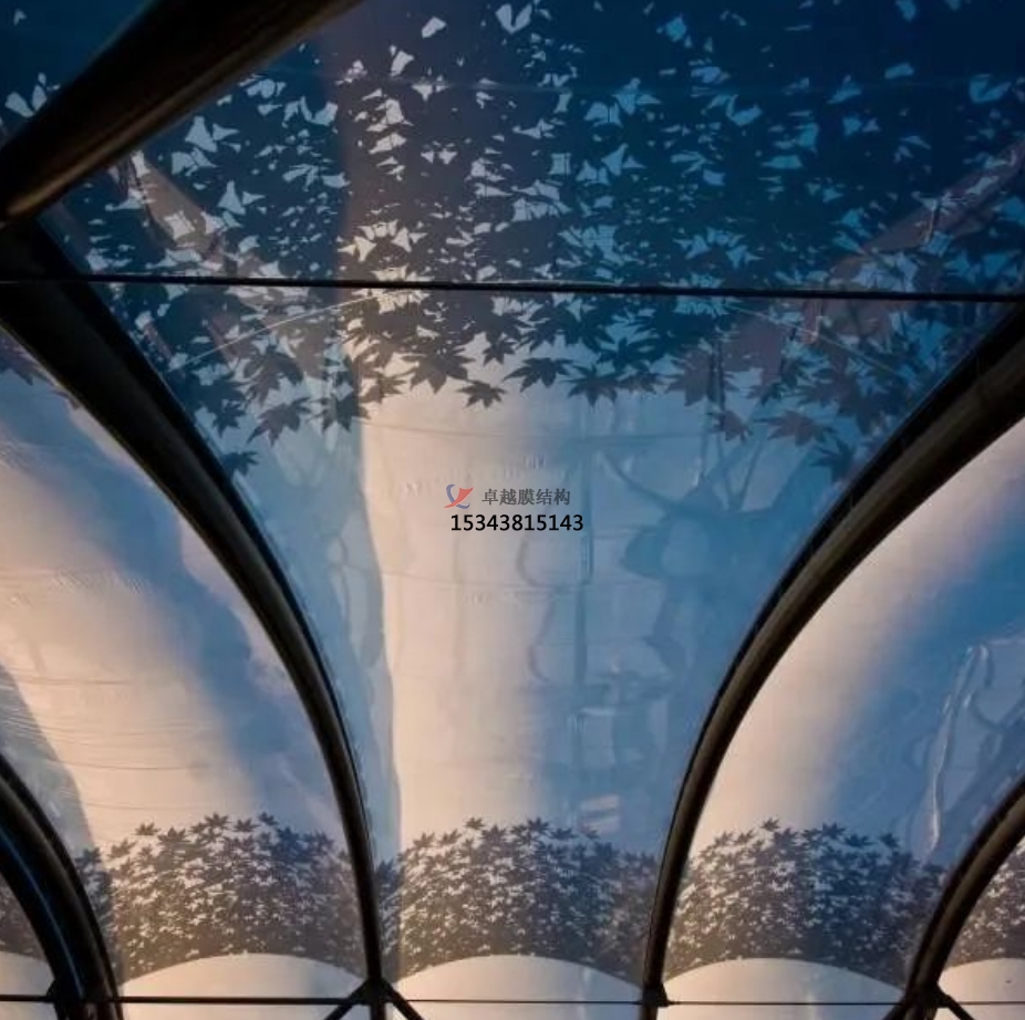 這里主要說(shuō)一下使用最廣泛的透明加花紋鍍點(diǎn)膜。在透明膜上增加花紋鍍點(diǎn),目的是調節陽(yáng)光的通過(guò)率,使屋面下的光照環(huán)境更舒適宜人。鍍點(diǎn)花紋的形狀、大小、排布間隔等,都是可以定制的。雖然膜材上加了鍍點(diǎn),但是當屋面離地面10米以上時(shí),視覺(jué)中,鍍點(diǎn)屋面看起來(lái)幾乎是透明的。