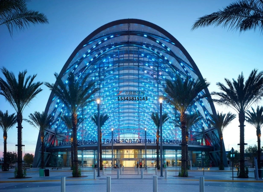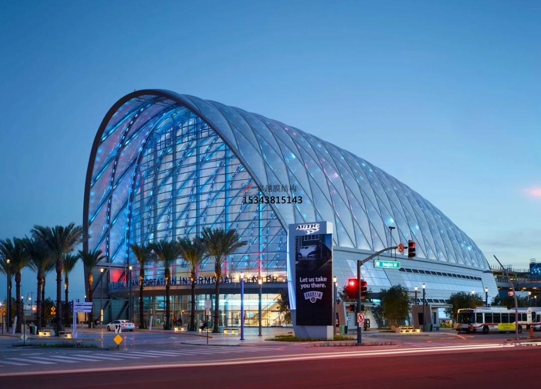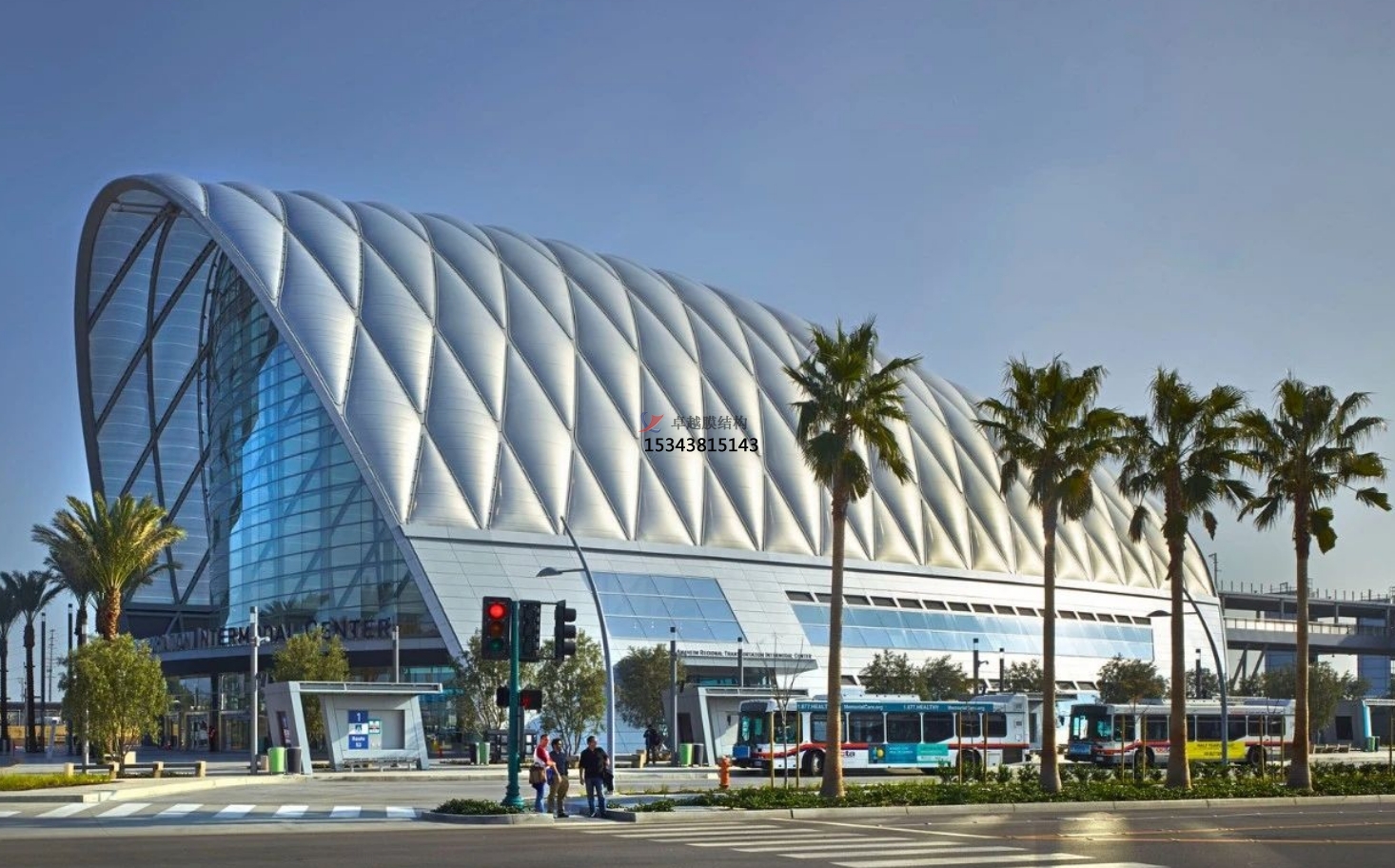 ETFE設計強度低,單層ETFE適用于跨度較小的結構,比較典型的應用是設置于桁架弦桿之間,形成采光帶,且通過(guò)ETFE與PVC/PTFE不同材質(zhì)的組合使用,產(chǎn)生更為豐富的視覺(jué)效果。