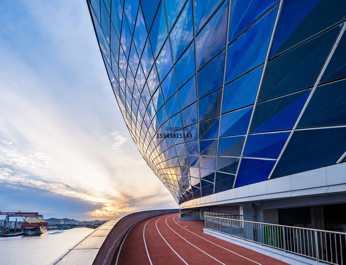梭魚(yú)灣足球場(chǎng)設計靈感來(lái)源于“海浪與海螺”,設計理念為“炫彩疊浪”,建筑立面定妝色“海洋藍”,頂棚呈白色,“藍海白云”與飾面象征波光粼粼的水之形態(tài),將大連的海洋文化、足球精神融于一體。
