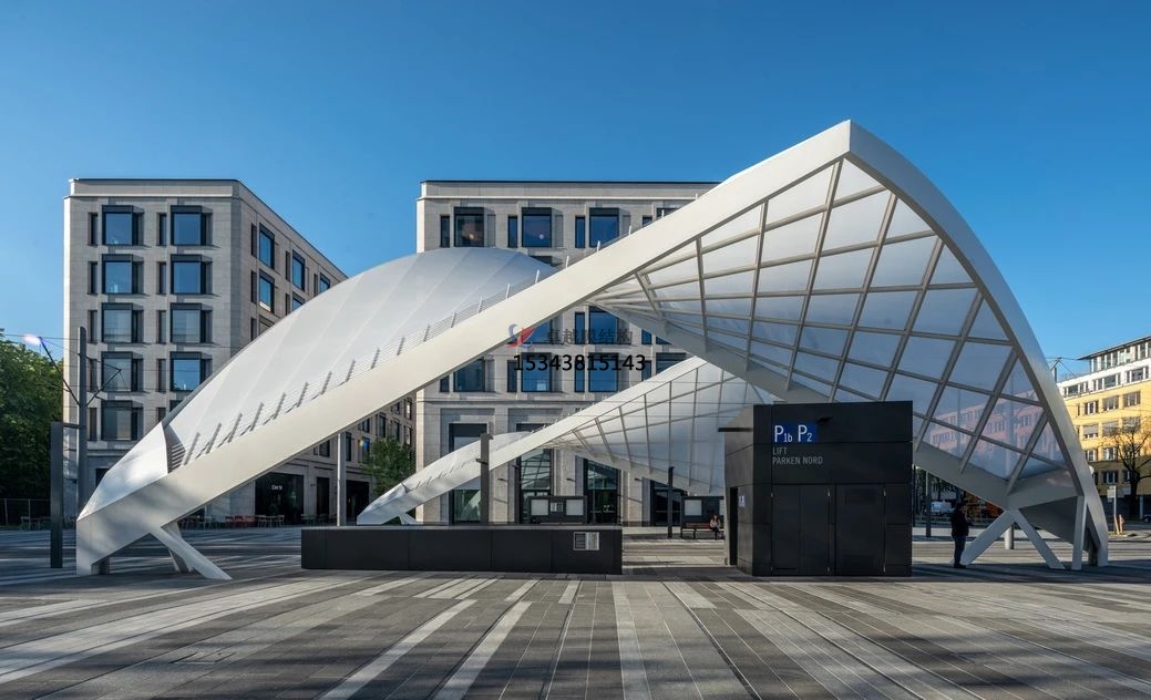 Schwabinger Tor是慕尼黑市新建的城區,由Felix Fischer Architekten設計的帶有彎曲檐篷的電車(chē)站成為該地區的標志性建筑,為城市的廣場(chǎng)空間賦予了獨特景觀(guān)。每個(gè)頂篷的表面積均為雙曲線(xiàn)拋物面,從而產(chǎn)生了一種低成本的高效靜態(tài)形式。兩個(gè)頂棚均由焊接的鋼梁制成,被單層平滑的 ETFE薄膜覆蓋。作為雙曲線(xiàn)形式的特殊功能,降落的雨水將自然流向地基,起到安全收集和排放的作用。