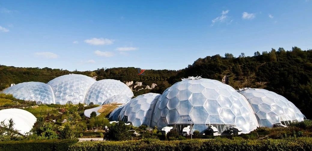 “伊甸園”項目位于英國的康沃爾郡,是在廢棄的礦山上建的全球最大的生態(tài)溫室。主要由8個(gè)充滿(mǎn)未來(lái)主義色彩的巨大蜂巢式穹頂建筑構成,其中每4座穹頂狀建筑連成一組。“伊甸園”的穹頂穹頂架由鋼管構成,拼成尺寸9米大小的六角形天窗,天窗中間鋪設半透明的ETFE薄膜材料。在形態(tài)上像放大了無(wú)數倍的“大水泡”。"大水泡"里培育著(zhù)原產(chǎn)于非洲、亞洲、歐洲、大洋洲和美洲的熱帶植物。