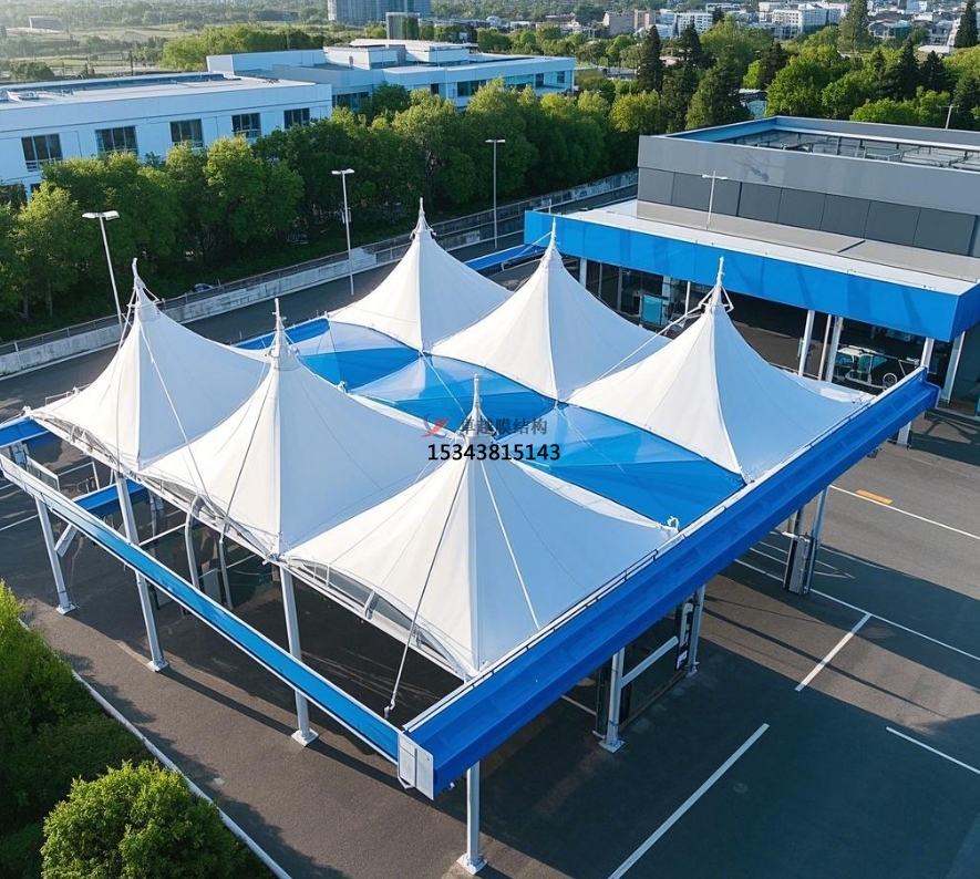后期維護成本:膜結構雨棚維護成本極低。膜材自潔性能使雨棚表面不易積垢,一般每年僅需 1 - 2 次簡(jiǎn)單清潔檢查即可保持外觀(guān)整潔。同時(shí),膜材與支撐結構耐久性好,正常使用下很少損壞,降低維修成本。反觀(guān)傳統結構雨棚,需定期進(jìn)行油漆保養、結構檢測等維護工作,成本較高。例如,某傳統鋼結構加氣站雨棚每年維護費用高達數萬(wàn)元,而采用膜結構的同類(lèi)型雨棚,年維護成本僅幾千元。