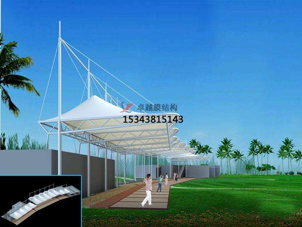 這種建筑以膜材、鋼索和支柱組成,利用鋼索與支柱在膜材中導入張力以達安定的形式。優(yōu)點(diǎn)具有結構性能強且美觀(guān)的造型。不過(guò)由于這種張拉膜工程要求的施工精度很高,雖然后期維護費用不高,但是工程造價(jià)就高于骨架式膜結構。