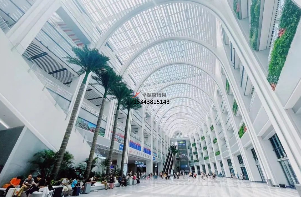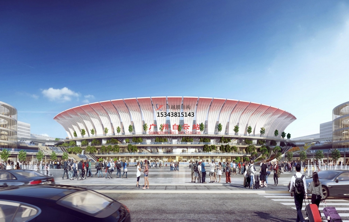 廣州白云站彩色PTFE膜結構項目,單個(gè)膜花瓣單元采用白色和彩色膜材拼接技術(shù)。結構上采用上下起伏的花蕾構造,這使得膜材在張拉過(guò)程中,需要充分考慮摩擦對本項目預張力施加的困難。同時(shí)因為單個(gè)裁剪單元細長(cháng),寬度最寬約1.2m,長(cháng)度大37m,其沿線(xiàn)長(cháng)度方向整體需要焊接,所以焊接的應力對本項目的影響尤為明顯。針對以上難點(diǎn),膜材進(jìn)場(chǎng)后,采用最先進(jìn)的雙軸拉伸設備對本項目的膜材進(jìn)行詳細的應力與應變關(guān)系的測試實(shí)驗,確保每一批次,每一張膜材在后期焊接接張拉過(guò)程中受力均勻,形態(tài)完美。