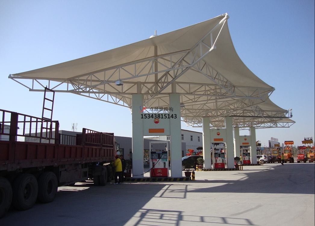 造型獨特:膜材料重量輕,適合加油站這種大跨度的建筑,而且是采用張力結構所以在造型設計上具有很大的優(yōu)勢,可以實(shí)現非常具有藝術(shù)氣息的造型。