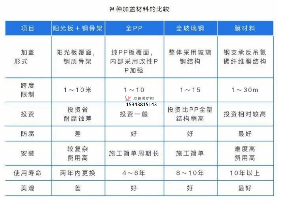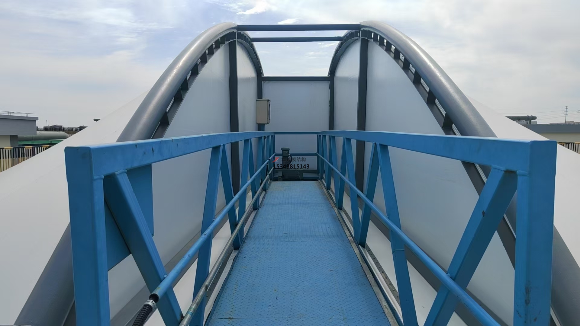 加蓋的方式有兩種,一種是加高蓋,一種是加低蓋。加高蓋的具體做法是在需加蓋的構筑物上加一個(gè)高度約1~5m的大蓋,將所有的池面、設備均罩在里面(走道板外挑可以不罩在里面);加低蓋的具體做法是在構筑物水面上加一個(gè)高度不超過(guò)2m的蓋,將所有的走道、設備均露在蓋外,僅將污水水面罩住。