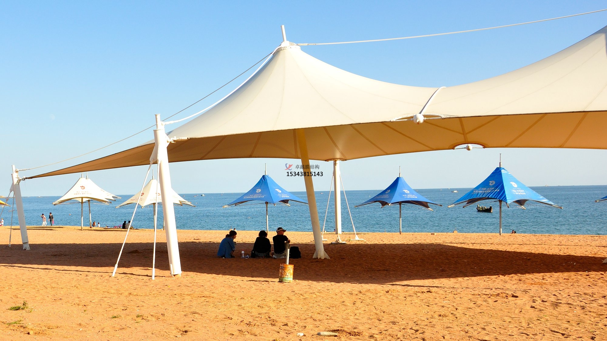 天津保稅區區標。已經(jīng)成為中國膜結構業(yè)界的里程碑,它標志著(zhù)中國膜結構劃時(shí)代的開(kāi)始,其中索膜結構是此工程的重點(diǎn)內容,44個(gè)獨立的膜結構單元體和鋼結構采用牽拉方式連接,面材為法國法拉利公司生產(chǎn)的型號為1002T。