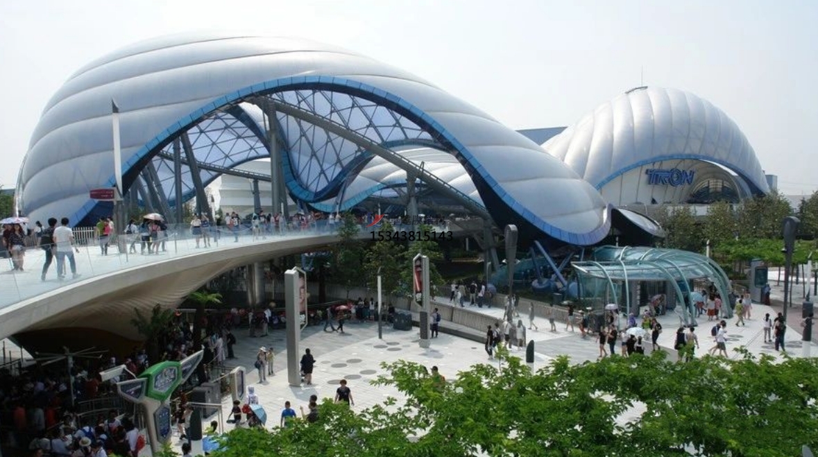 膜結構,以高強度柔性薄膜材料與支撐體系相結合,形成具有一定剛度、能覆蓋大空間的結構形式。其材料通常為聚酯纖維基布或玻璃纖維基布,表面覆以聚氯乙烯(PVC)涂層或聚四氟乙烯(PTFE)涂層。這種材料具有輕質(zhì)高強的特點(diǎn),其重量?jì)H為傳統建筑材料的幾十分之一,卻能承受較大的拉力。例如,在一些大型高鐵站的膜結構雨棚中,看似輕薄的膜材在精心設計的支撐體系下,穩穩地為旅客遮風(fēng)擋雨,抵御各種惡劣天氣。