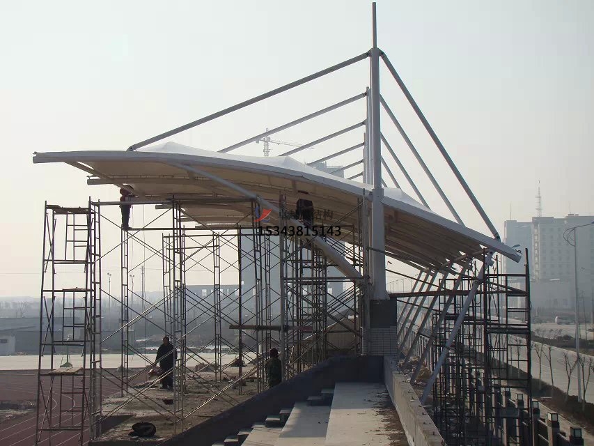 膜結構安裝時(shí)要安排好和主體結構安裝單位的關(guān)系,協(xié)調相互間的進(jìn)度;施工時(shí)注意天氣預報,保證在整個(gè)安裝過(guò)程中無(wú)四級以上大風(fēng)和大雨;安裝過(guò)程中發(fā)生膜面破損需要立即進(jìn)行修補,膜面應力張拉不可一次到位,以防主體結構側向失穩,應分塊逐步張拉到位; 膜面張拉到位后,監理將會(huì )同安裝單位質(zhì)檢人員對膜面張力按照結構設計提供的膜面應力值、測試部位和測試工具對膜面應力進(jìn)行全面檢查驗收,另外做好防水密封工作。