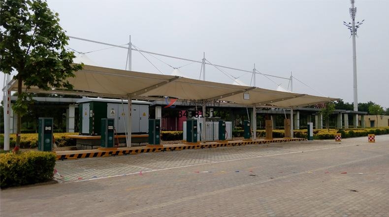商業(yè)廣場(chǎng)雨棚搭建的篷布采用PVC/PVDF/PTFE/ETFE,而膜材的更大特點(diǎn)是強度高、耐久性好、防火難燃、自潔性好,不受紫外線(xiàn)影響,使用壽命長(cháng),一般15-30年。具有高透光率,透光率為13%,對熱能反射率73%,熱吸收量很少。正是因為這種劃時(shí)代的膜材料的發(fā)明,使商業(yè)廣場(chǎng)雨棚搭建成為現代化的永久建筑。
