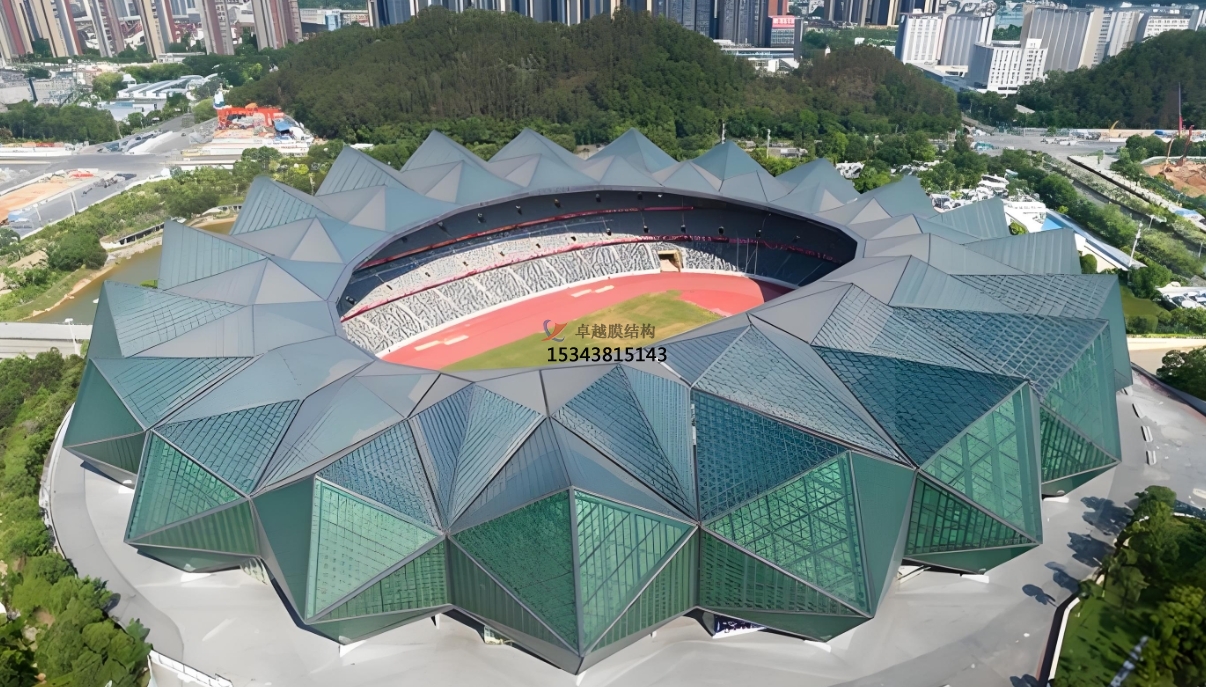 深圳大運會(huì )體育中心一場(chǎng)兩館采用空間折板結構,外觀(guān)類(lèi)似“鉆石”。外層采用陽(yáng)光板及玻璃幕墻,內層采用透光率高、吸音率強、自潔性能好的網(wǎng)格內膜材料。深圳大運會(huì )體育中心的網(wǎng)格內膜面積超過(guò)10萬(wàn)平方米。
