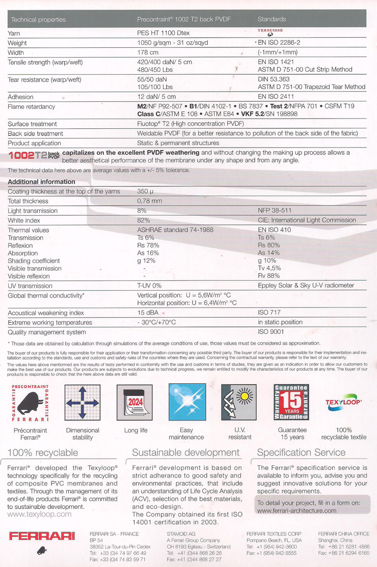 法拉利膜材十多年來(lái),法拉利(PVDF)表面處理的復合膜材被應用在全世界重要的織物建筑工程中?,F在,第代膜材再次確認了這一出眾材料性能的更新發(fā)展。法拉利研發(fā)了第代材料正是為了滿(mǎn)足建筑師和業(yè)主在新世紀之初對于織物建筑提出的要求。這一 全新的膜材得益于更新的科研技術(shù),即將PVDF和硬化介體完美地結合。這種特殊的結合明顯地提高了材料的機械強度、使用壽命,并能長(cháng)期保持織物建筑的原始 美觀(guān)。第代膜材在積累了10多年的經(jīng)驗的基礎上,可以提供專(zhuān)業(yè)保證。法拉利現在能夠根據要求和每個(gè)項目的具體情況,提供12年質(zhì)量保證 (PRECONTRAINT702除外)。