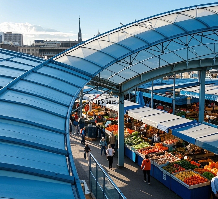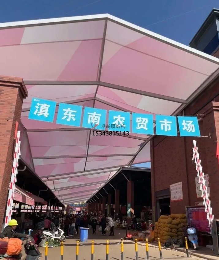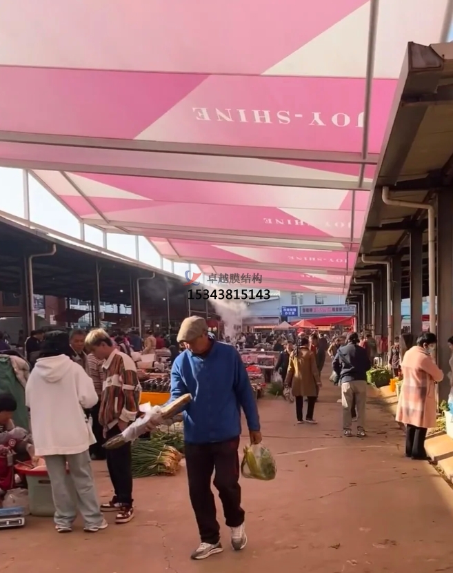 美觀(guān)與個(gè)性化彰顯:膜結構設計極具創(chuàng )意,能依據農貿市場(chǎng)所在區域的文化特色、建筑風(fēng)格,定制獨特造型與色彩?;蛉珈`動(dòng)的波浪,或似展翅的飛鳥(niǎo),為傳統農貿市場(chǎng)注入現代時(shí)尚元素,提升市場(chǎng)整體形象與辨識度。鮮明的色彩搭配,不僅能吸引消費者目光,還能為市場(chǎng)營(yíng)造活潑、熱鬧的氛圍,讓農貿市場(chǎng)成為城市中一道獨特的人文景觀(guān),成為居民休閑購物的好去處,帶動(dòng)周邊商業(yè)活力。