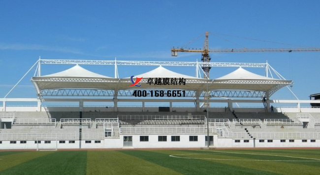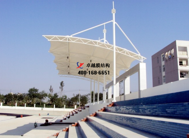 膜結構看臺,周口體育場(chǎng)膜結構看臺頂棚,膜結構看臺雨棚,操場(chǎng)主席臺遮陽(yáng)棚等張拉形式膜結構的先行者是德國的奧托(F.Otto),他在1955年設計的張拉膜結構跨度在25m左右,用于聯(lián)合公園多功能展廳。