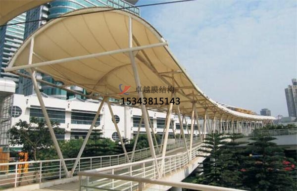 以膜材、鋼索及支柱構成,利用鋼索與支柱在膜材中導入張力以達安 定的形式。除了可實(shí)踐具創(chuàng )意,創(chuàng )新且美觀(guān)的造型外,也是能展現膜結 構精神的構造形式. 大型跨距空間也多采用以鋼索與壓縮材構成鋼索網(wǎng)來(lái)支撐上部膜材的形式。因施工精度要求高,結構性能強,且具豐 富的表現力,所以造價(jià)略高于骨架式膜結構景觀(guān)。