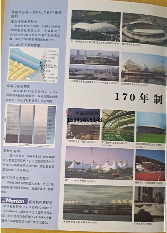 德國MEHLERHAKU米樂(lè )公司擁有165年(1837年一2003年)的制造業(yè)經(jīng)驗。通過(guò)1S09001質(zhì)量體系認證,所有產(chǎn)品均經(jīng)過(guò)嚴格的DIN德國工業(yè)標準,以及各個(gè)國家的膜材工業(yè)標準。2002年,德國米樂(lè )公司獲聘為中華人民共和國建設部《索膜建筑結構制品》行業(yè)標準編制委員成員。德國米樂(lè )的產(chǎn)品系列涵蓋環(huán)保等各種PVC膜材領(lǐng)域,包括:建筑工程、輕型結構、廣告、遮陽(yáng)、汽艇、軍用、裝飾、水利環(huán)保,等等。