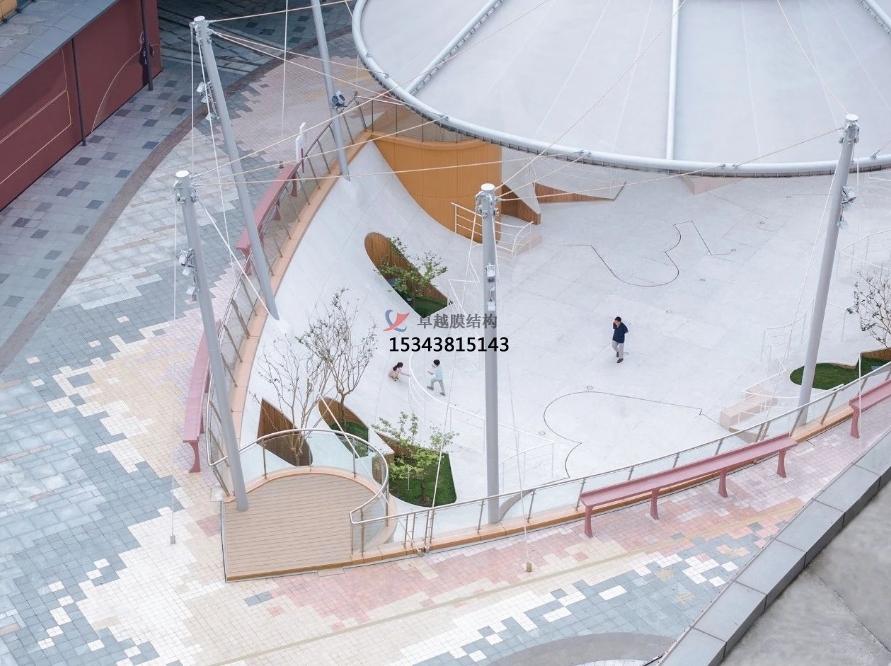“浮庭”由上方如同水母般漂浮的半透明織物膜結構與下方懸浮感的地景花園共同組成。膜結構既成為了廣場(chǎng)的頂蓋,形成包覆與洞天的感受,也作為織連體引導主要流線(xiàn)銜接了室外幾個(gè)重要節點(diǎn)。結合原混凝土柱的加寬基礎上支起鋼柱,以懸吊與支承合作的形式將膜結構撐起,減少了廣場(chǎng)中結構的出現。