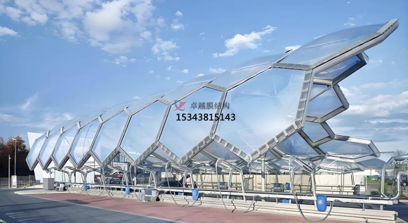 以下是膜結構產(chǎn)品的主要應用和特點(diǎn):膜結構自行車(chē)棚和機動(dòng)車(chē)棚,膜結構景觀(guān),膜結構污水池加蓋,膜結構體育場(chǎng)館和展會(huì )建筑,膜結構藝術(shù)裝置,膜結構充電樁和收費站。膜結構自行車(chē)棚采用輕質(zhì)且堅固的膜材料,具備優(yōu)異的抗風(fēng)、抗雨雪能力,同時(shí)具有自潔性,減少維護成本。其優(yōu)雅的造型和多樣的色彩選擇,使其成為城市中的一道靚麗風(fēng)景線(xiàn),而機動(dòng)車(chē)棚的篷布采用PVC、PVDF、PTFE、ETFE等材料,具有高強度、耐久性好、防火難燃、自潔性強等特點(diǎn)。其透光率為13%,熱能反射率為73%,能有效減少熱吸收,使用壽命可達15-30年4。膜結構景觀(guān)是一種耐用、高強度的涂層織物,具有柔韌的質(zhì)地、重量輕、透光性極佳等特點(diǎn),常被用于公園、廣場(chǎng)等場(chǎng)所,成為吸引眼球的藝術(shù)景觀(guān)。隨著(zhù)工業(yè)污染的加劇,膜結構污水池加蓋因其環(huán)保、施工簡(jiǎn)便等優(yōu)勢,逐漸成為工業(yè)污水處理的首選。其鋼材料使用量少,能有效解決池體跨度過(guò)大的施工難題。膜結構在體育場(chǎng)館和展會(huì )建筑中的應用,不僅縮短了建設工期,降低了造價(jià)成本,還減少了環(huán)境污染。其大跨度的設計和高透光性,為場(chǎng)館提供了良好的采光和空間感。膜結構藝術(shù)裝置設計簡(jiǎn)單、造型獨特,不僅具有藝術(shù)展示效果,還能為人們提供休息場(chǎng)所,廣泛應用于公園、景區等場(chǎng)所。膜結構充電樁和收費站以其耐用性和美觀(guān)性,成為現代城市基礎設施的重要組成部分,為人們提供便捷服務(wù)的同時(shí),也大大提升了城市形象。