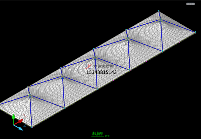 該圖片是污水池反吊膜結構長(cháng)方形污水池封閉頂視圖,鋼構外面做支撐,帽口式連續反吊。