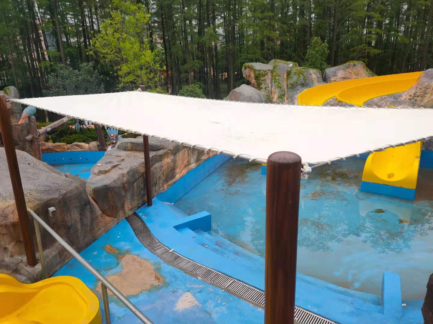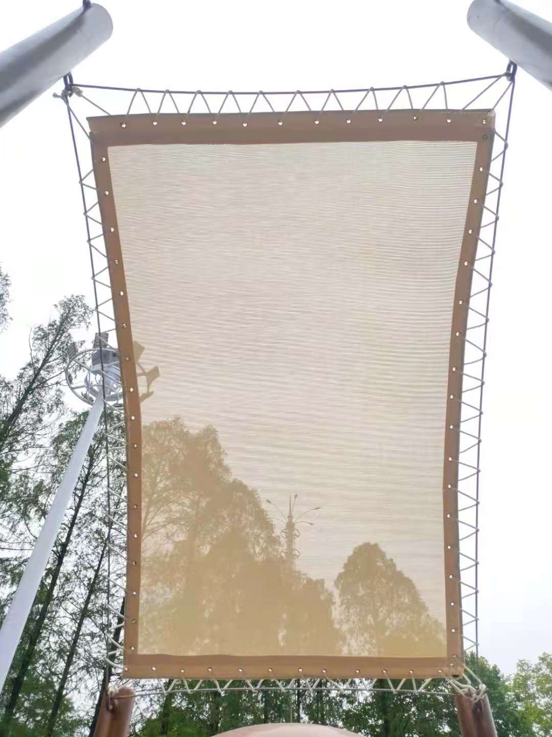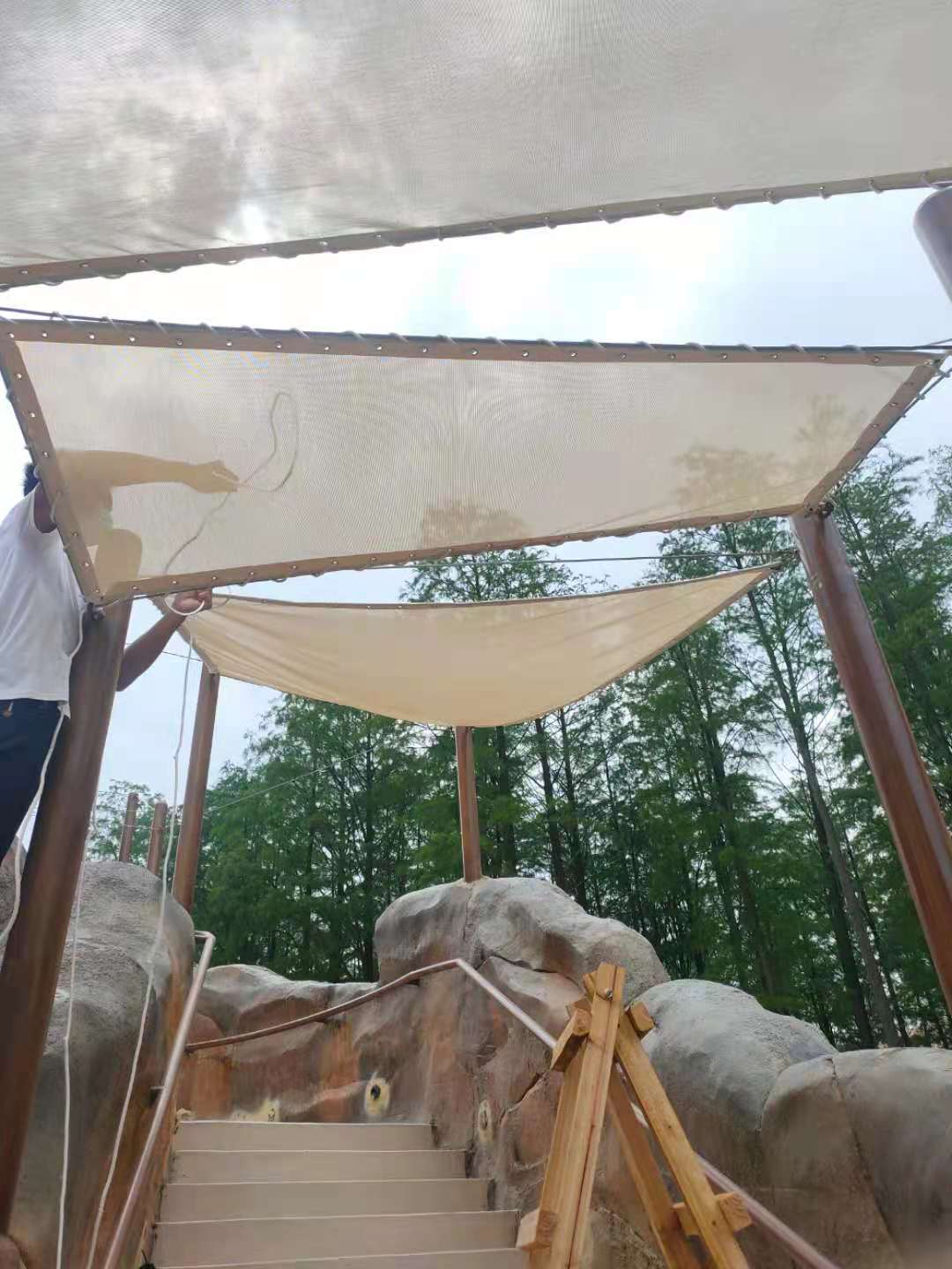 武漢瑪雅公園膜結構景觀(guān),是我公司與游樂(lè )設備公司配套工程,材料遮陽(yáng)效果好,質(zhì)量輕,采用法國進(jìn)口彩色法拉利網(wǎng)格膜材,空運到我廠(chǎng)深加工后,現場(chǎng)安裝完成的,完工時(shí)間2021年4月7日
