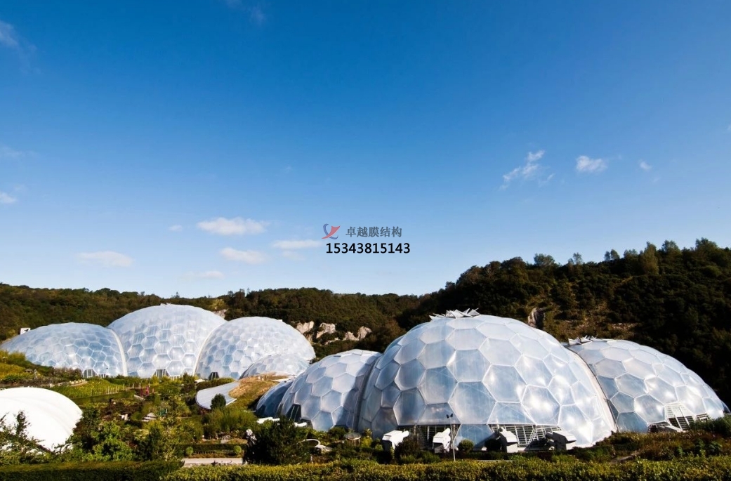 分為氣承式(整體氣壓支撐)與氣脹式(局部氣囊支撐)兩類(lèi)。如某海灘餐廳項目采用32個(gè)橢圓形氣枕構成1655㎡屋面,通過(guò)氣壓差維持結構張力,配合六邊形印花實(shí)現動(dòng)態(tài)遮陽(yáng)。