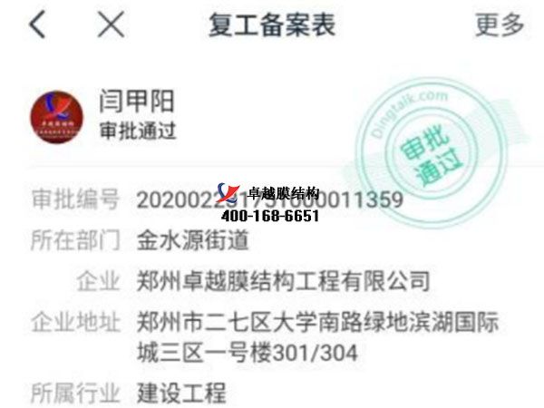 今天你復工了嗎?我們卓越膜結構工程有限公司經(jīng)過(guò)層層審批,更終批準于2020年3月2號正式復工。
