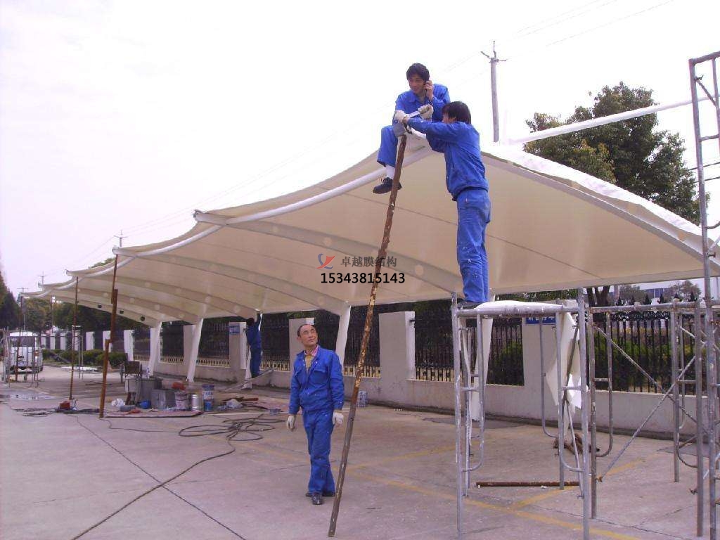 膜結構的停車(chē)棚是解決小區停車(chē)難的問(wèn)題, 膜材料的涂層是采用的是PVc樹(shù)脂,由于是隨著(zhù)使用的期長(cháng),PVc樹(shù)脂中的塑性劑是會(huì )移到膜材料的表面而黏著(zhù)空氣及雨水中的臟物使表面的是變臟,而一旦的是被黏著(zhù)的臟物就很難清洗掉。