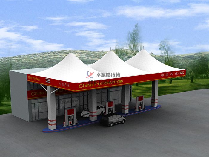 項目結構形式:骨架式膜結構加油站加氣站,四面自然排水,一側與站房搭接。
