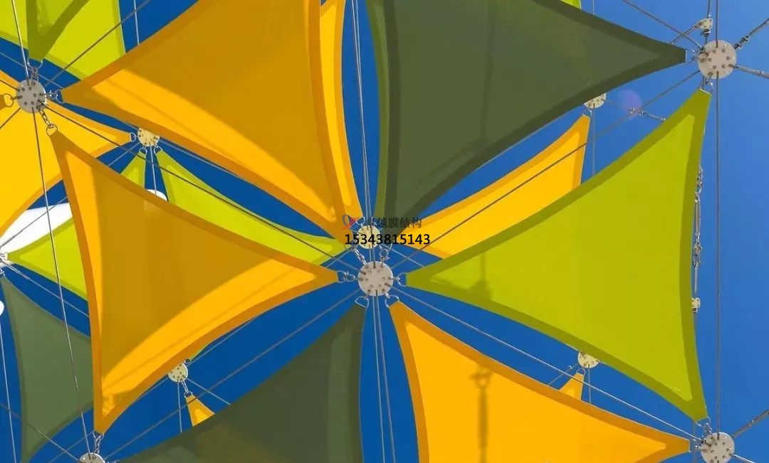 381網(wǎng)孔膜開(kāi)孔度為4%,具有很好的遮陽(yáng)透氣功效。Soltis92織物織就的明黃,明綠及暗綠的三角遮陽(yáng)帆層層疊疊,在自然光及夜景燈光下非常好看。