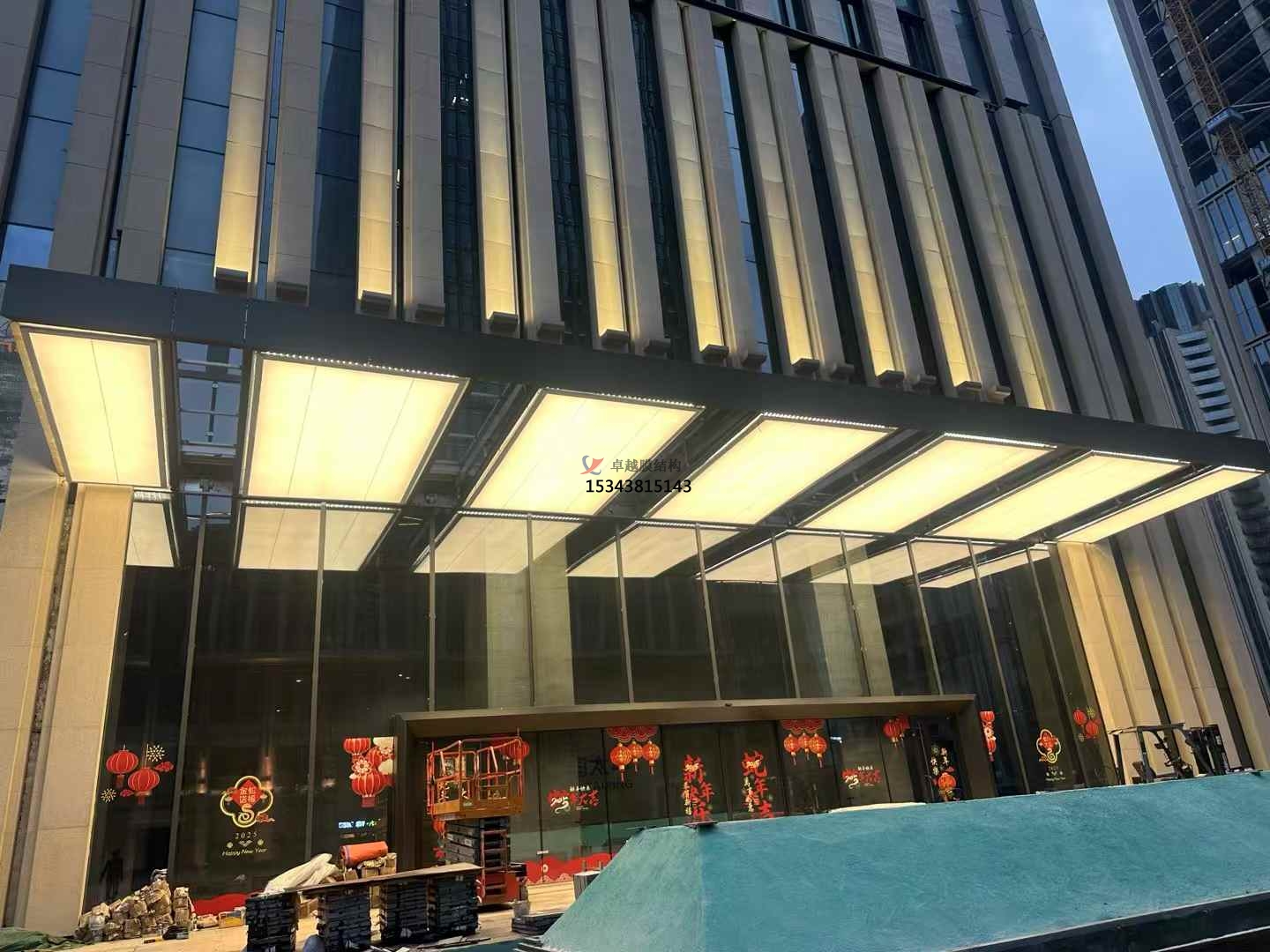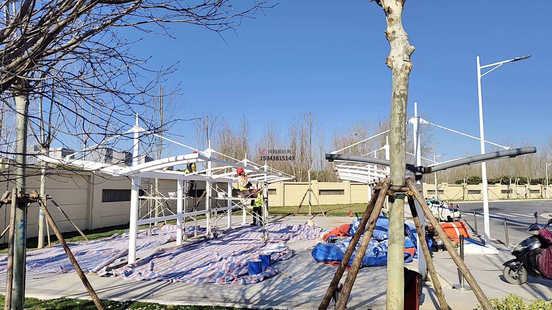 - 膜材張緊:在膜材固定和連接完成后,通過(guò)調整支撐結構或使用專(zhuān)門(mén)的張緊設備,對膜材進(jìn)行張緊,使其達到設計要求的張力狀態(tài)。張緊過(guò)程中要密切關(guān)注膜材的變形情況,確保其變形在允許范圍內,且膜面平整、無(wú)褶皺。同時(shí),要使用測量?jì)x器對膜材的張力進(jìn)行監測和控制,保證各部位的張力符合設計值。