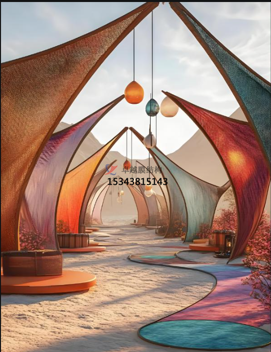 ?。汗珗@中的休息亭、花架、遮陽(yáng)廊等景觀(guān)小品,使用 PTFE 網(wǎng)格覆膜進(jìn)行覆蓋,可與周?chē)淖匀痪坝^(guān)相融合,形成獨特的景觀(guān)效果,為游客提供舒適的休息和觀(guān)賞空間。