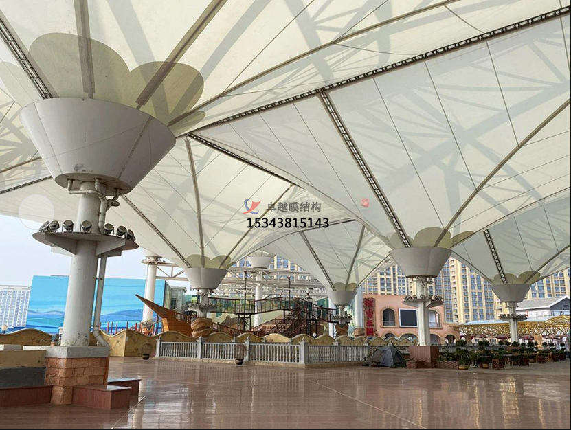 展廳需要寬敞、靈活的展示空間,PTFE 膜的大跨度張拉特性使得內部空間幾乎無(wú)柱阻礙,為展廳的布置提供了極大的便利。此外,通過(guò)膜面對陽(yáng)光的反射能夠有效降低室內能耗,幫助調節室內溫度,減少空調負荷,提高能源效率。其自潔性還能確保在長(cháng)期使用過(guò)程中,展廳外觀(guān)始終如新,維護成本低,保證了展廳的高效運營(yíng)。