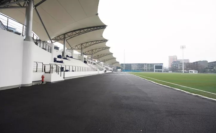 另外是隨著(zhù)時(shí)間的推移,PTFE建筑膜材的顏色會(huì )逐漸的由原來(lái)的淡黃色變?yōu)榘咨?,下面是景天膜結構之前的一個(gè)案例,銀行學(xué)校PTFE膜結構看臺剛建成以及以建成之后的對比照片。