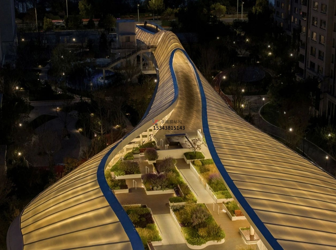 該半透明法拉利進(jìn)口PTFE膜材,遮陽(yáng)防水,自然采光,既可以保證日間二層屋頂花園能夠有充分光照,夜間也可利用膜的反射來(lái)提供屋頂花園的照明功能需求。