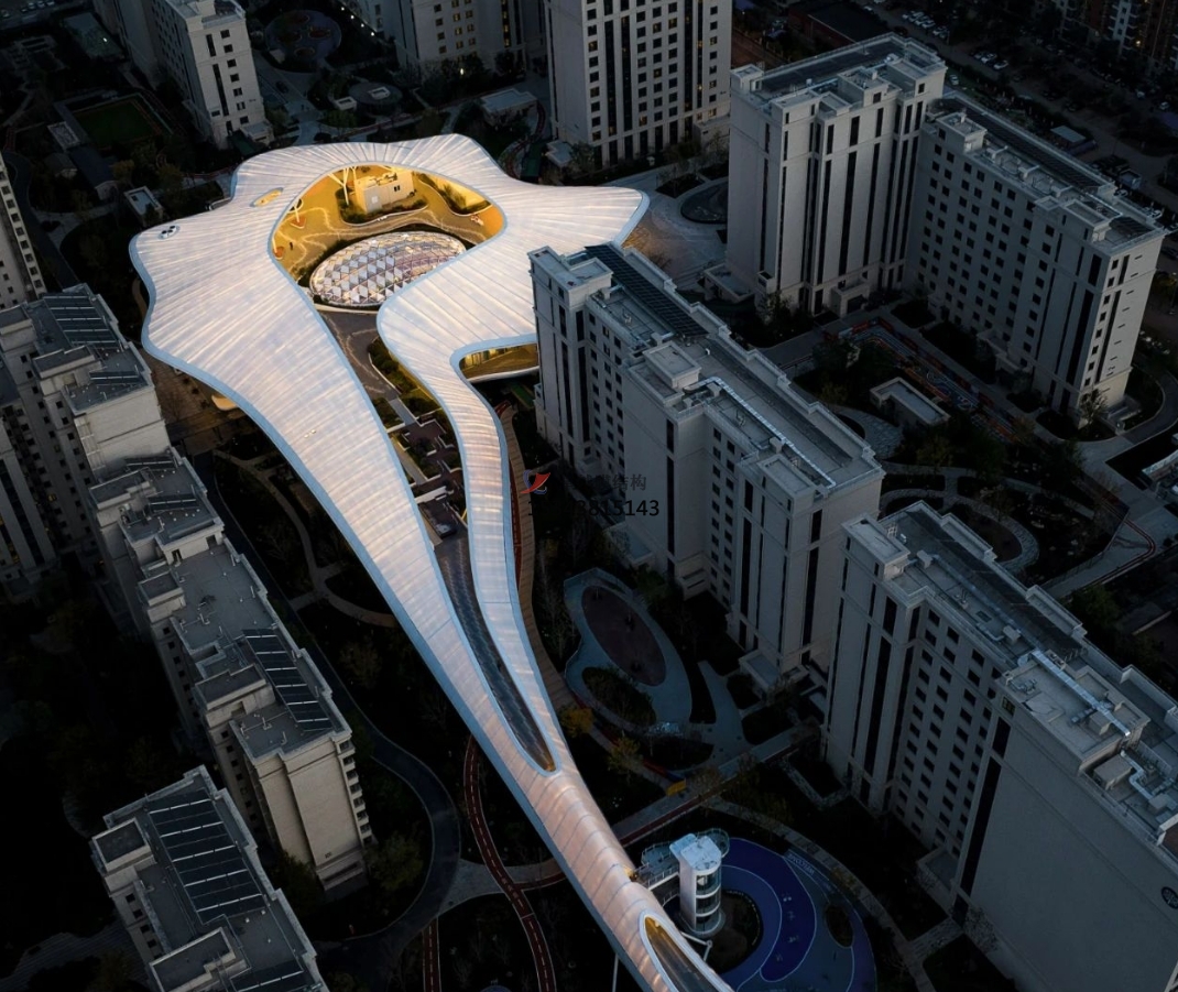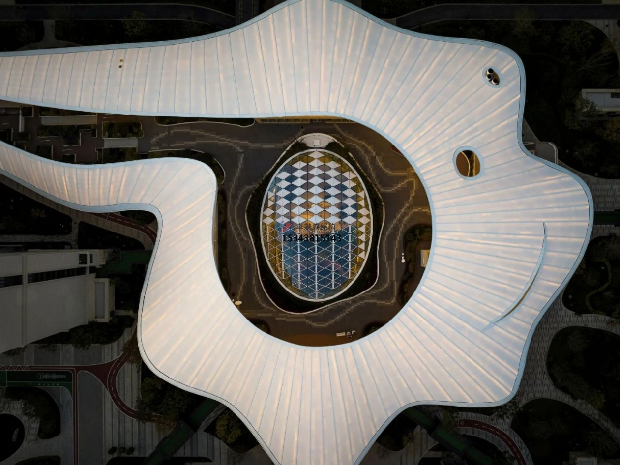 相對于四周規則的建筑形態(tài),活力中心呈現更加自由和充滿(mǎn)活力的有機形態(tài):如一顆水珠滴落,在場(chǎng)地中激起漣漪,自中心散開(kāi)、升騰,形成一片白色、柔軟的云朵,最終轉化為自由的大屋頂。
