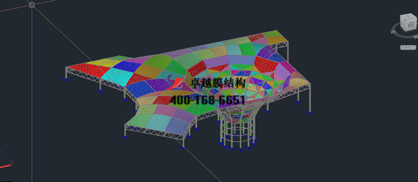 膜結構設計時(shí),應在滿(mǎn)足膜面應力平衡狀態(tài)的條件下,使結構體系保持穩定。還應考慮使用階段局部膜片破壞或局部索退出工作,以及對不同部位膜單元進(jìn)行二次張拉或更換對整體結構的影響。