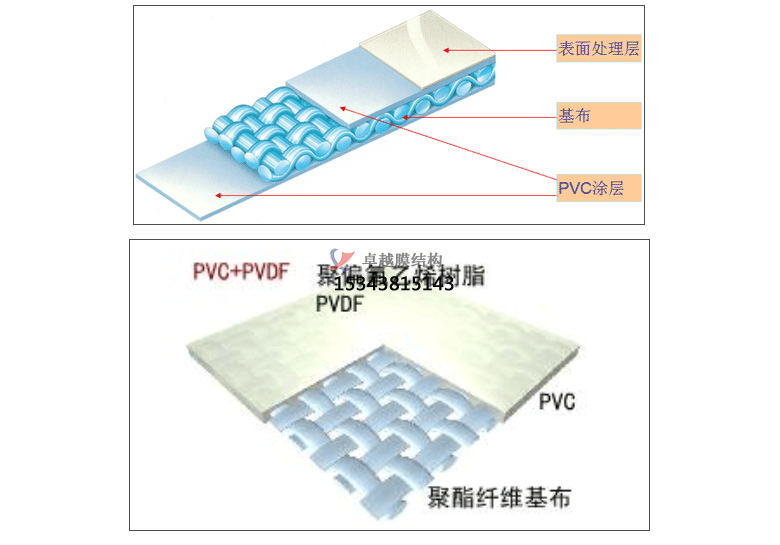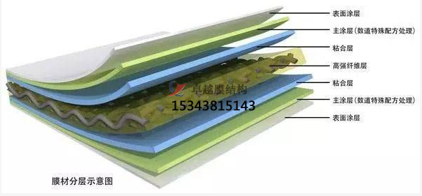 PVDF膜材加工是在聚酯纖維基布上涂上Pv(聚氬乙烯)樹(shù)酯后加上100%PVDF(聚偏氟乙烯)表面涂層而成的復合材料。PVDF膜權由于自潔性良好、價(jià)格適中、運輸安裝方使,更廠(chǎng)泛應用于各類(lèi)建筑領(lǐng)域。它的壽命因不同的表面涂層而異,一股可達成10-25年,其構造形式見(jiàn)下圖: