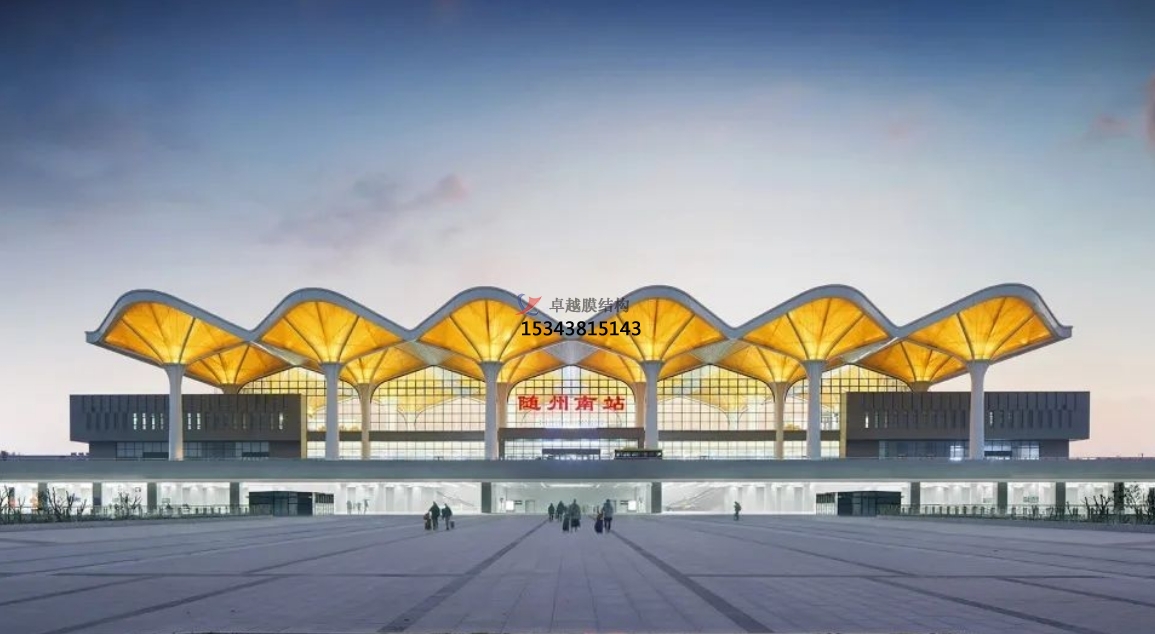 隨州高鐵站:隨州高鐵站站房采用了膜結構設計,通過(guò)驗算不同膜材的最大適用跨度,最終選用了滿(mǎn)足要求的膜材方案。該站房膜結構造型獨特,既美觀(guān)又實(shí)用,成為隨州市的新地標。
