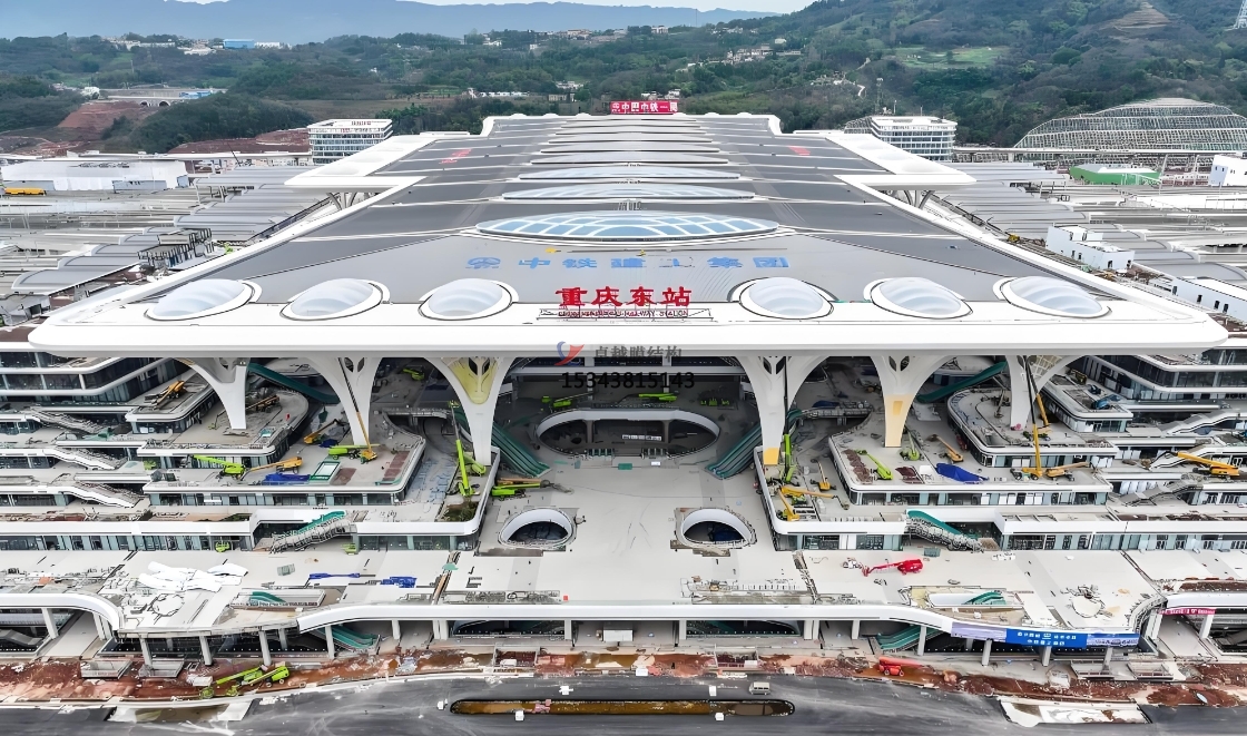 重慶東站:正在建設的重慶東站屋蓋體系采用了“管桁架鋼結構+橢圓形天窗+樹(shù)形支撐柱+ETFE氣枕膜”形式。這種設計不僅實(shí)現了大跨度的覆蓋,還通過(guò)ETFE氣枕膜的應用為整個(gè)項目增添了獨特的視覺(jué)效果。