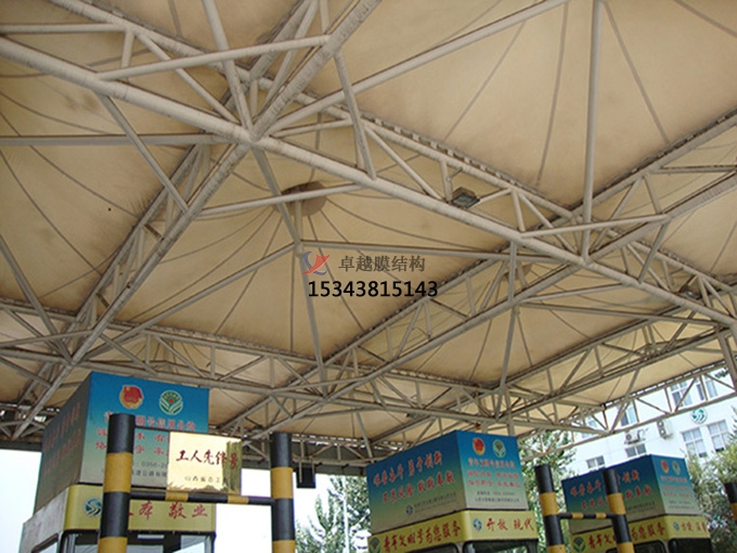 二、膜結構建筑可以實(shí)現無(wú)柱大跨度。只需要較少的結構鋼來(lái)支撐,可以設計用于大跨度、無(wú)障礙空間。這使得薄膜結構成為收費站屋頂等大跨度懸臂建筑的理想選擇。
