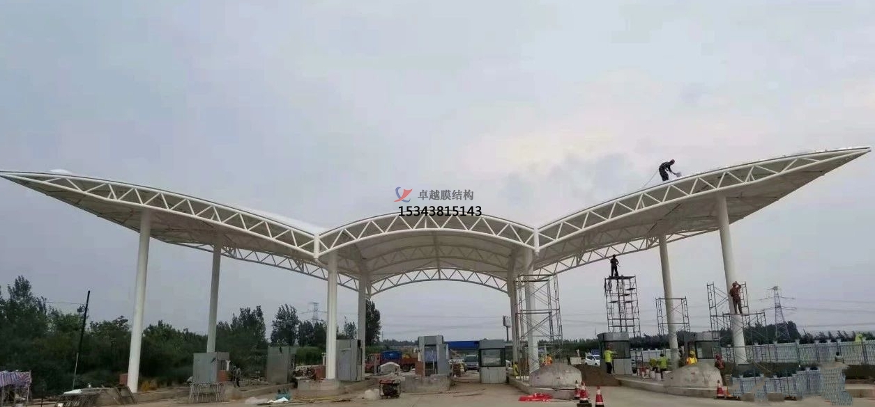 張拉膜結構形式的收費站頂棚以膜材、鋼索及支柱構成,利用鋼索與支柱在膜材中導入張力以達安定的形式,這種形式非常適合大跨度的建筑結構,除了可實(shí)踐具有創(chuàng )意、創(chuàng )新且美觀(guān)的造型外,也是最能展現膜結構精神的構造形式,其施工精度要求高,結構性能強,且具豐富的表現力。