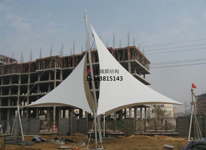 這是我司太原及周邊地區完工的膜結構景觀(guān)工程案例,膜結構景觀(guān)給人們對白色或米白色膜材會(huì )有很好的色彩感知,因為這兩種色彩表現出對可見(jiàn)光具有線(xiàn)性光譜透射的特點(diǎn)。透射程度隨透射光波長(cháng)的增加而增加,這使得透射光比人射光還略溫暖。透射光譜與纖維及其特點(diǎn)、涂層的厚度以及附加面層有關(guān),相對于傳統涂理PVC的聚醋纖維膜材,涂覆PTFE的玻瑞纖維膜材的透射光譜更加均勻具有外觀(guān)新穎,經(jīng)濟適用,適用壽命長(cháng),節能透光等優(yōu)點(diǎn)。深受廣大用戶(hù)的好評,我司所有工程全部通過(guò)專(zhuān)業(yè)膜結構軟件計算通過(guò),結構安全,質(zhì)量可靠。