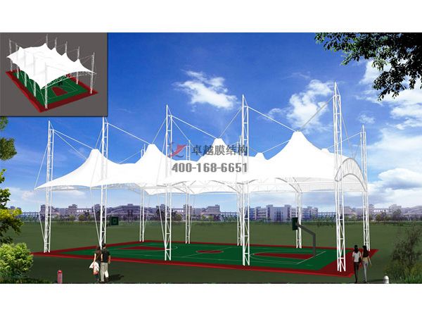 1.網(wǎng)球場(chǎng)膜結構項目以膜材、鋼索及支柱構成,利用鋼索與支柱在膜材中導入張力以達安定的形式。除了可實(shí)踐具創(chuàng )意,創(chuàng )新且美觀(guān)的造型外,也是能展現膜結構精神的構造形式。大型跨距空間也多采用以鋼索與壓縮材構成鋼索網(wǎng)來(lái)支撐上部膜材的形式。因施工精度要求]高,結構性能強,且具豐富的表現力,所以造價(jià)略高于骨架式膜結構。